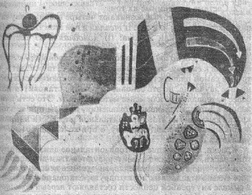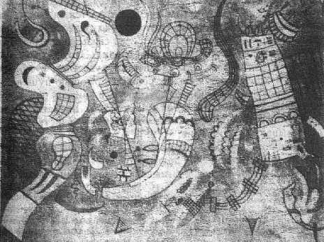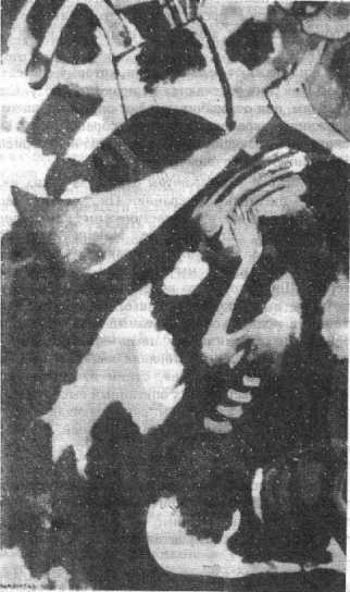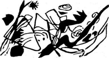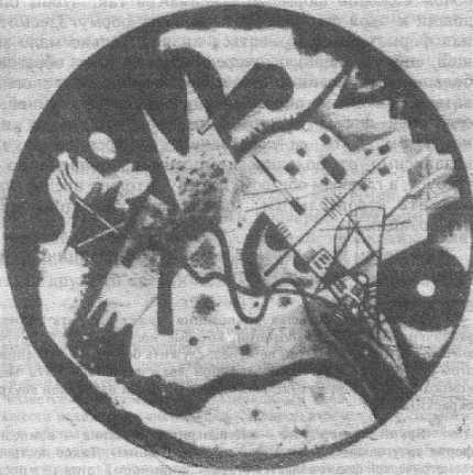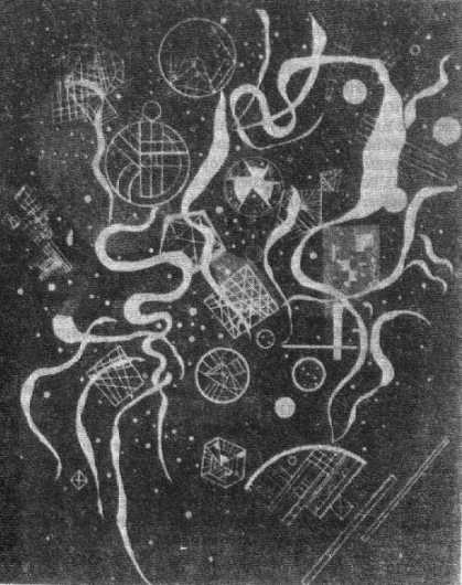 и довольно равномерного распределения.** Невольно вспоминаются старинные хоровые композиции, Моцарт и, наконец, Бетховен. Все эти произведения имеют большее или меньшее сродство с возвышенной, полной покоя и достоинства архитектурой готического собора: равновесие и равномерное распределение отдельных частей являются камертоном и духовной основой подобных конструкций. Подобные произведения принадлежат к переходным формам.В качестве примера новых симфонических композиций, в которых мелодический .элемент находит применение лишь иногда и как одна из подчиненных частей, но получает при этом новую форму, я прилагаю репродукции трех моих картин.