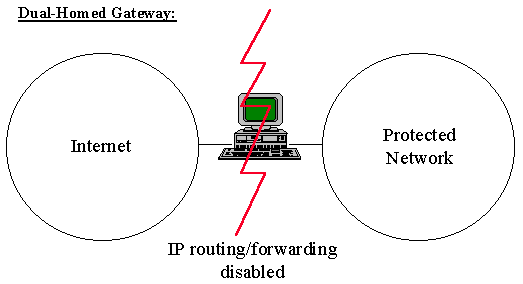 Example Application level firewall: In this example, an application level firewall called a "dual homed gateway" is represented. A dual homed gateway is a highly secured host that runs proxy software. It has two network interfaces, one on each network, and blocks all traffic passing through it.