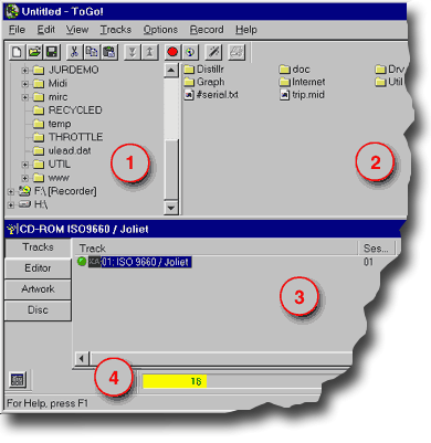 Подготовка проекта к записи (выбор файлов и каталогов для перенесения на CD-R) осуществляется аналогичным с AUDIO CD образом: в левом верхнем окне выбираем нужный диск (1), в правом верхнем - нужный каталог или файл (2), хватаем "мышкой" и тянем в нижнее окно (3) на надпись "Untitled" (если это новый проект). Наблюдаем за состоянием служебной строки, где отображается суммарный объем подготовленной нами для записи информации (4) - если он превысит 650 МБ, программа откажется выполнять запись до тех пор, пока вы не удалите лишнюю информацию из проекта.